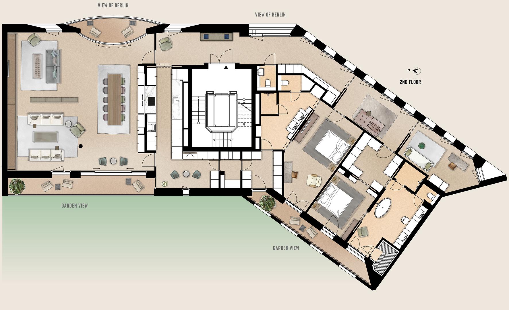 The luxuriously furnished DELUXE RESIDENCES impress with absolute spaciousness and are therefore suitable for up to five residents. In the representative living and dining room with "View of Berlin Loge", you can enjoy wonderful moments with family and friends. Two bedrooms with dressing room and bathroom en suite as well as a sauna offer maximum living comfort, which is complemented by a private office and guest area with bathroom en suite. Living and sleeping areas are elegantly separated. Two extensive terraces with garden views complete the exclusive atmosphere in the middle of the city. Ideal for a relaxing stay in Berlin-Mitte.