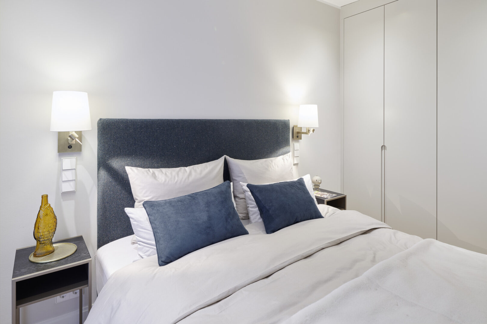 Das Apartment N°5 der SOPHIE, im Erdgeschoss/Hochparterre, erstreckt sich über ca. 61 m² und kombiniert luxuriöse Ausstattung mit modernem Komfort. Der edle Eichen-Dielenboden und die 17 cm hohen Sockelleisten schaffen eine elegante Wohnatmosphäre. Die Fußbodenheizung sorgt für behagliche Wärme. Die raumweise gesteuerten Kühldecken gewährleisten ein angenehmes Klima das ganze Jahr über. Große Fensterfronten lassen viel Tageslicht herein und bieten beeindruckende Ausblicke. Individuell steuerbare Lichtkonzepte und ein integriertes Sonnenschutzsystem sorgen für höchsten Wohnkomfort und Privatsphäre.