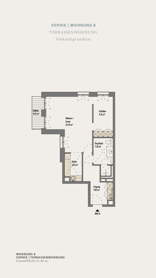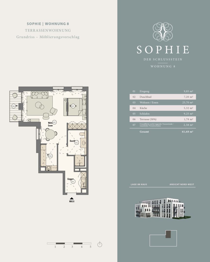 Das Apartment N°8 der SOPHIE, im Erdgeschoss/Hochparterre, erstreckt sich über ca. 62 m² und kombiniert luxuriöse Ausstattung mit modernem Komfort. Der edle Eichen-Dielenboden und die 17 cm hohen Sockelleisten schaffen eine elegante Wohnatmosphäre. Die Fußbodenheizung sorgt für behagliche Wärme. Die raumweise gesteuerten Kühldecken gewährleisten ein angenehmes Klima das ganze Jahr über. Große Fensterfronten lassen viel Tageslicht herein und bieten beeindruckende Ausblicke. Individuell steuerbare Lichtkonzepte und ein integriertes Sonnenschutzsystem sorgen für höchsten Wohnkomfort und Privatsphäre.