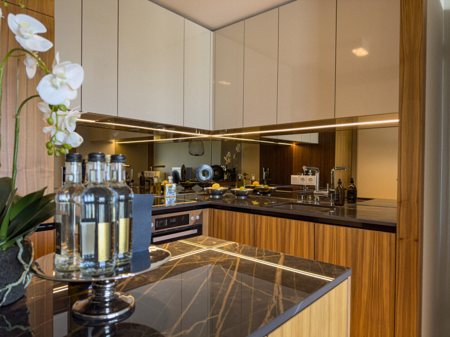 Die Wohnung befindet sich in der 16.Etage und überzeugt mit Qualität und Wohnlichkeit: großzügiger Wohn‑/Essbereich mit offener, hochwertiger Einbauküche, Schlafzimmer, Gäste‑ oder Arbeitszimmer, Duschbad mit stilvollem Waschtischunterschrank, bodentiefe französische Fenster und Mehrschichtparkett. Fußbodenheizung, individuell steuerbarer Sonnenschutz, Video‑Gegensprechanlage und durchdachte Stauraumlösungen vollenden den Anspruch modernen Wohnkomforts.